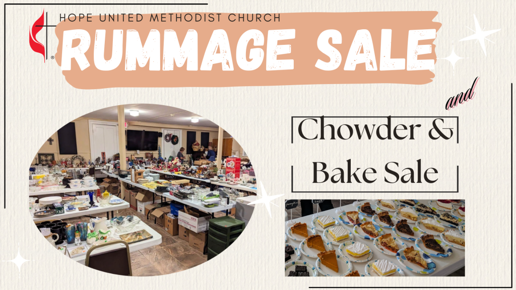 Don’t miss our annual Rummage Sale plus Chowder and Baked Goods sale! Saturday, May 3rd from 9:00am-2:00pm at Hope United Methodist Church. We have TONS of gently used items, such as furniture, clothes, and other home goods. Plus homemade pies and baked goods, chowder, and roast beef sandwiches! Food sales start at 11:00am and go while supplies last. Bag sale starts at 1:00pm. Bags are only $1! You won’t beat these prices and proceeds go to a great cause!